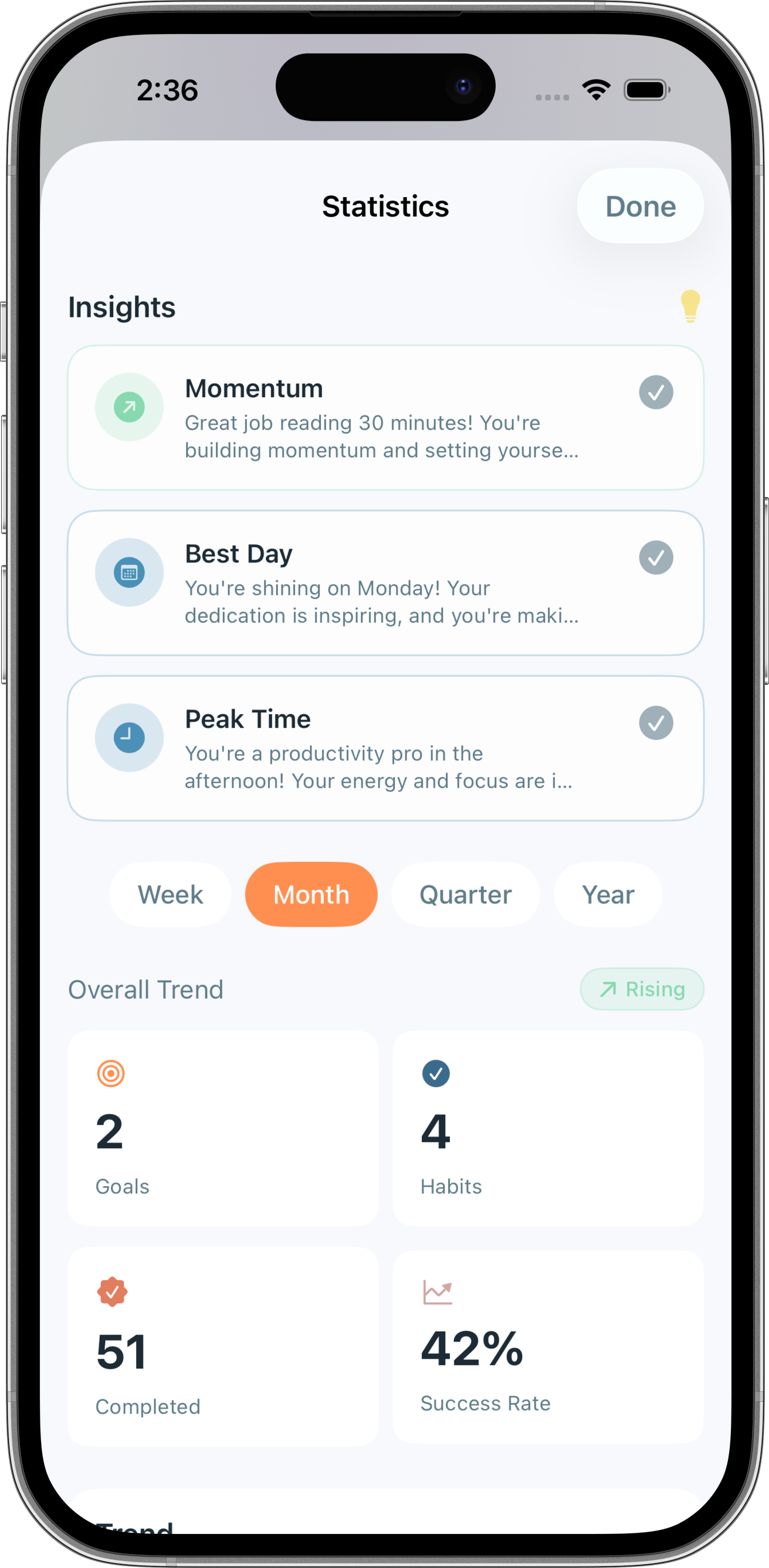 Adaptive Analytics zeigen dir, was funktioniert und wann. Verstehe deine Muster. Sieh dein Momentum. Nicht nur sinnlose Streak-Zahlen.