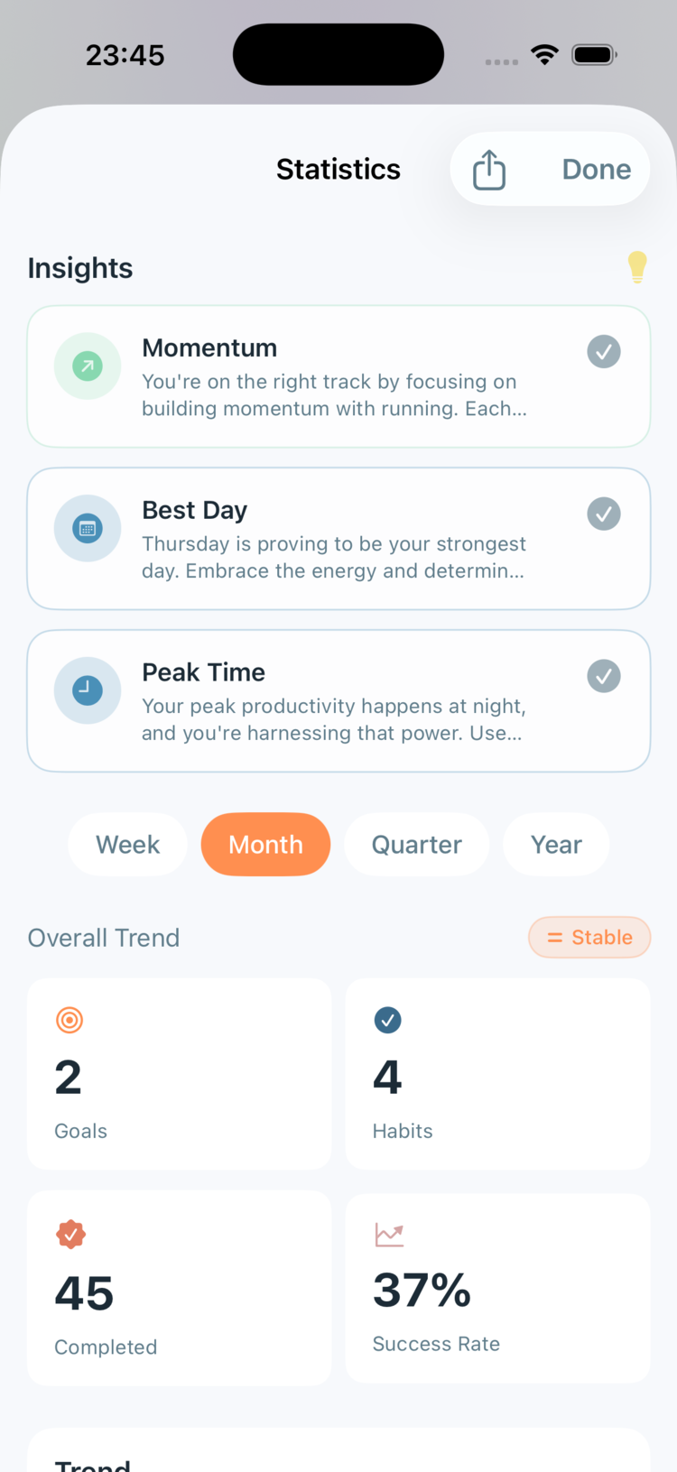 Welche Wochentage sind stark? Welche Habits verstärken sich gegenseitig? Adaptive Analytics zeigen dir, was bei DIR funktioniert.