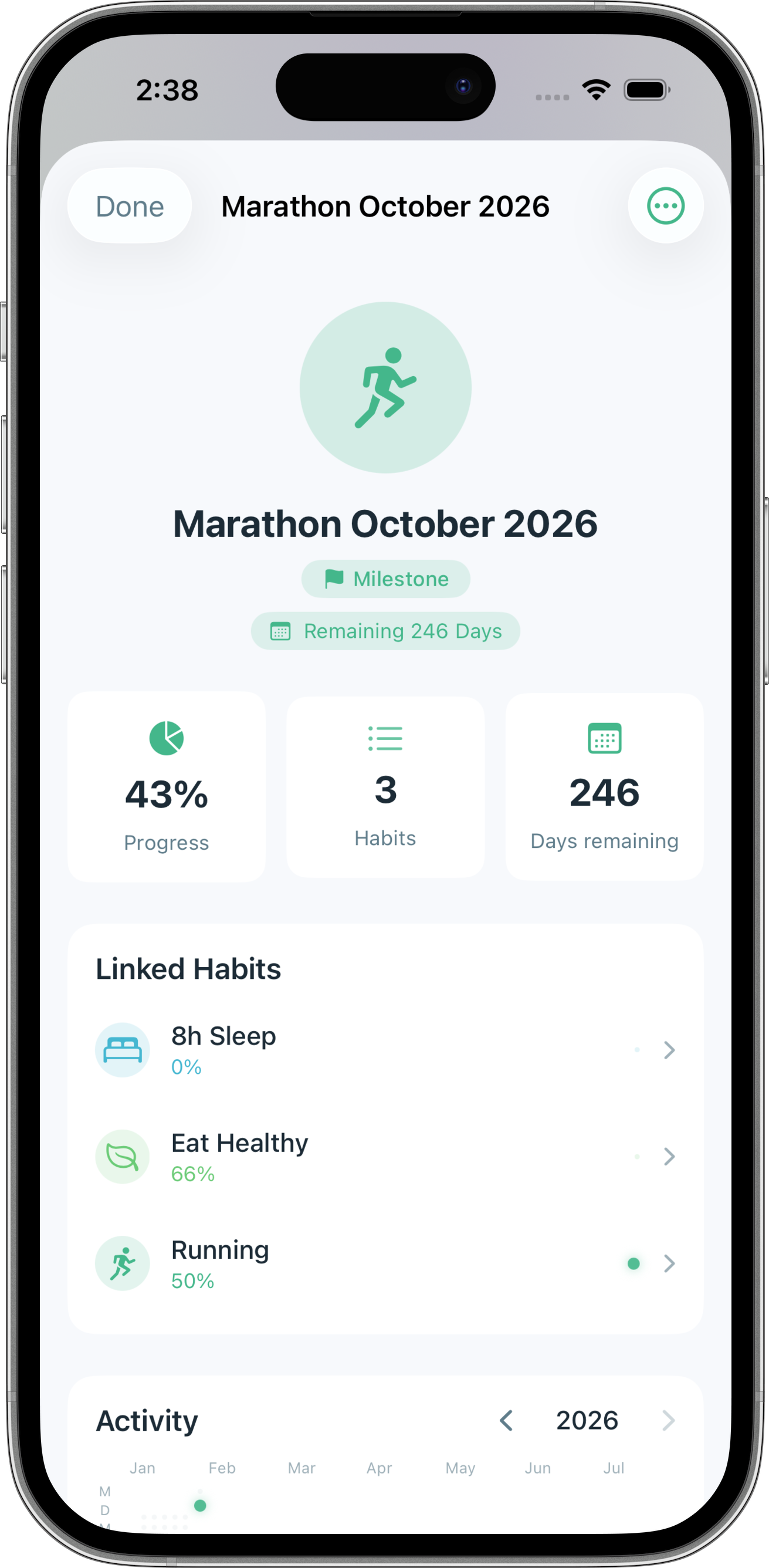DopaLoop fragt nicht: "Welche Habits trackst du?" Sondern: "Was willst du erreichen?" • Nicht "Laufen tracken" → Sondern "Marathon in 6 Monaten" • Nicht "Meditation tracken" → Sondern "Innere Ruhe finden" • Nicht "Gesund essen tracken" → Sondern "Mehr Energie im Alltag" Dein Ziel ist der Anker. Habits sind Werkzeuge. Das "Warum" hält länger als jede Streak-Zahl.